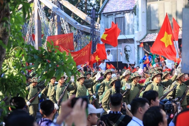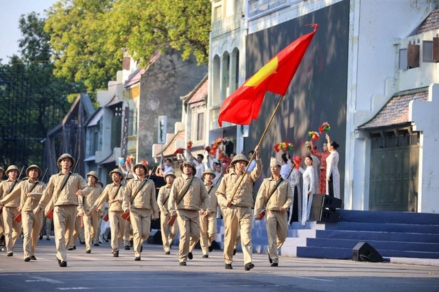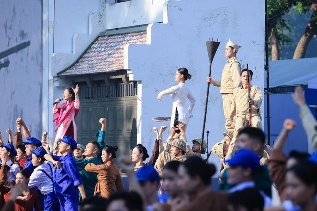 Khoảnh khắc hào hùng này được tái hiện bằng những màn biểu diễn thực cảnh quy mô lớn, với sự tham gia của gần 1.000 chiến sĩ cùng 200 nghệ sĩ, diễn viên múa. Những hình ảnh quen thuộc như cầu Long Biên, nơi đoàn quân tiến vào tiếp quản Thủ đô, hay cột cờ Hà Nội, nơi lá cờ đỏ sao vàng tung bay trong lễ chào cờ đầu tiên vào ngày 10-10-1954, đã được tái hiện trên sân khấu.