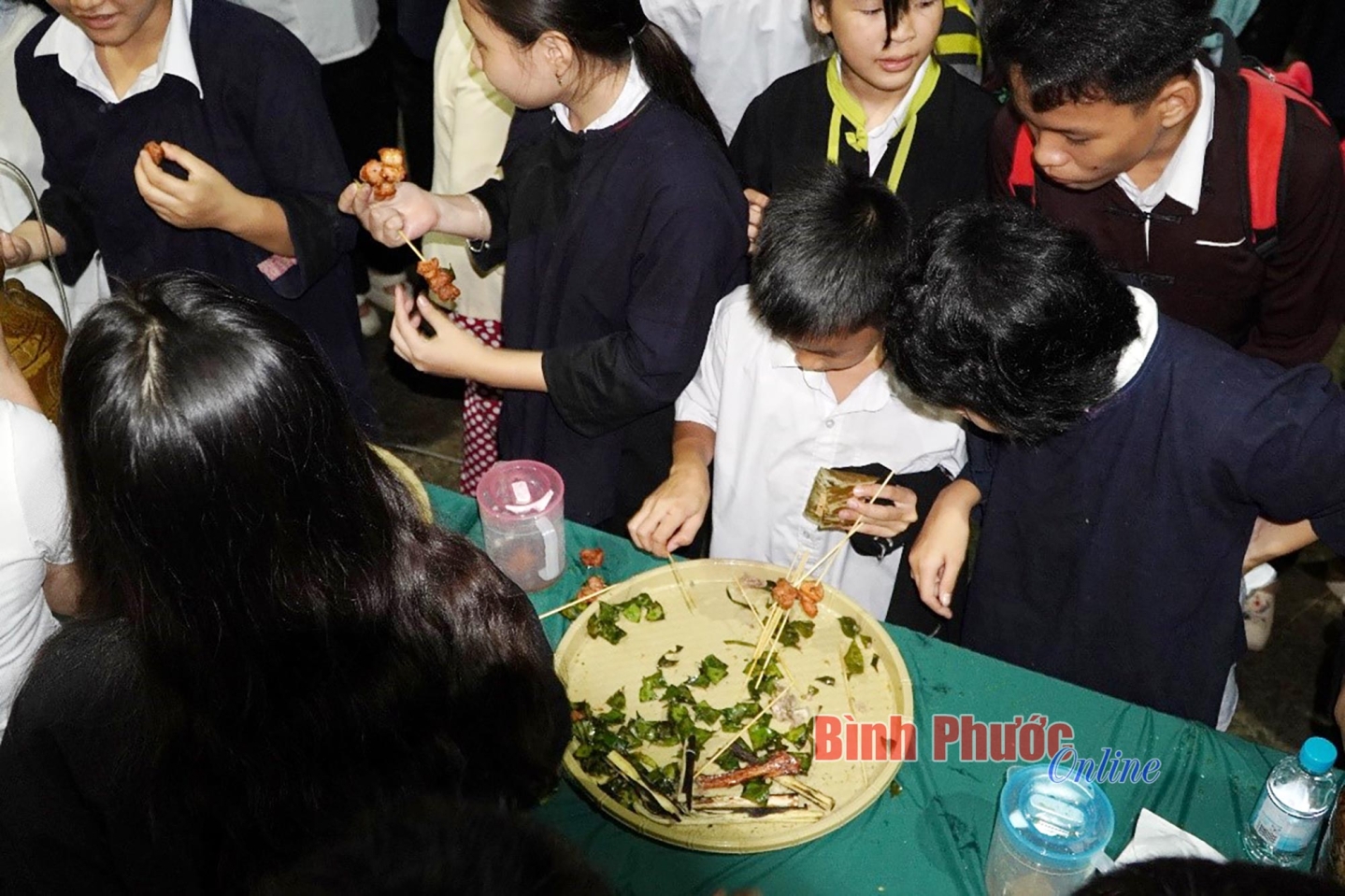 Các em học sinh và người dân thích thú khi được thưởng thức các món ăn và rượu cần