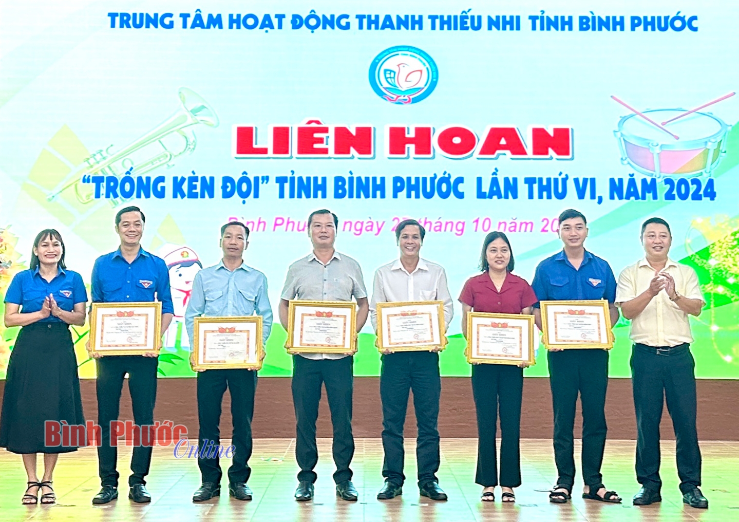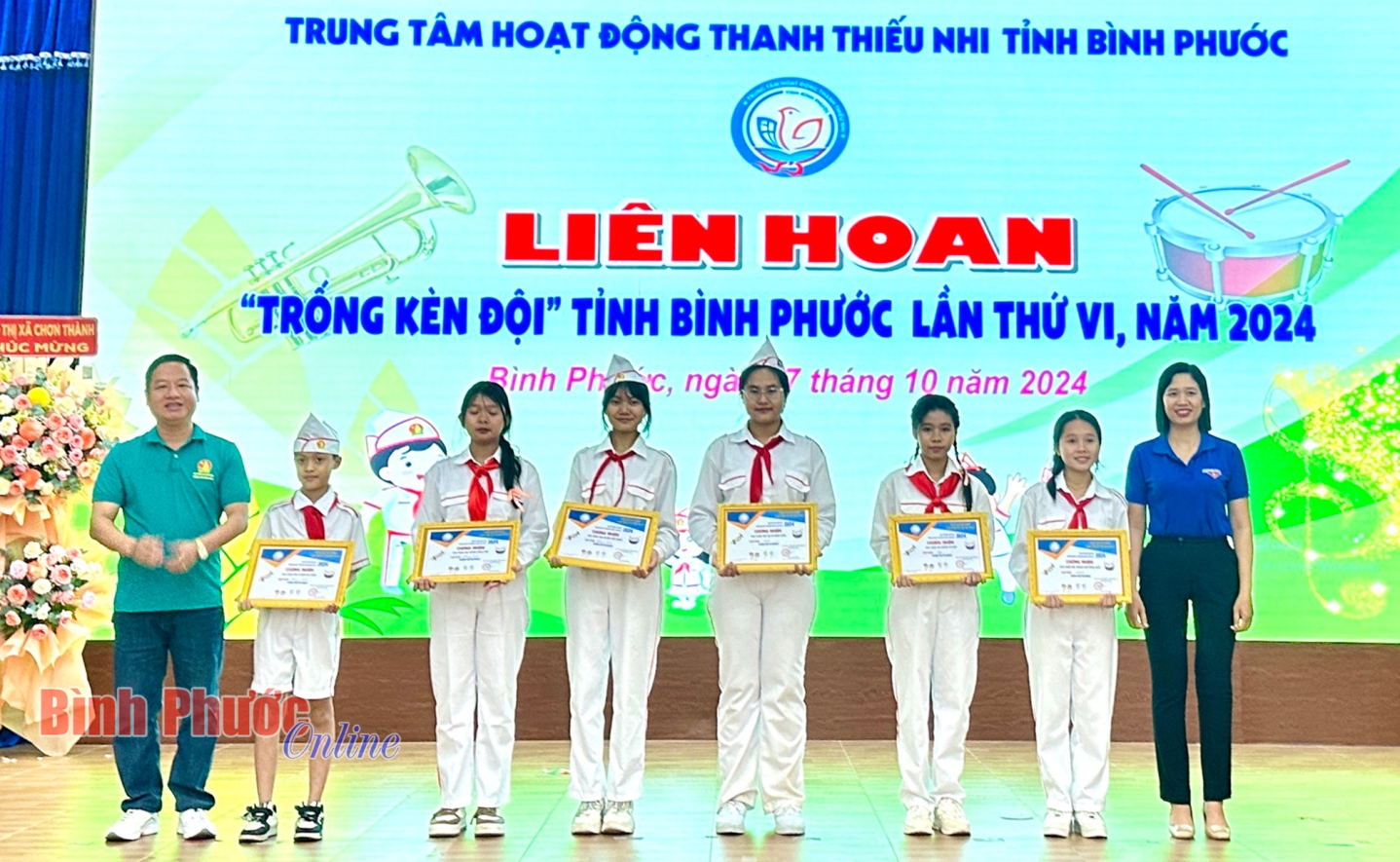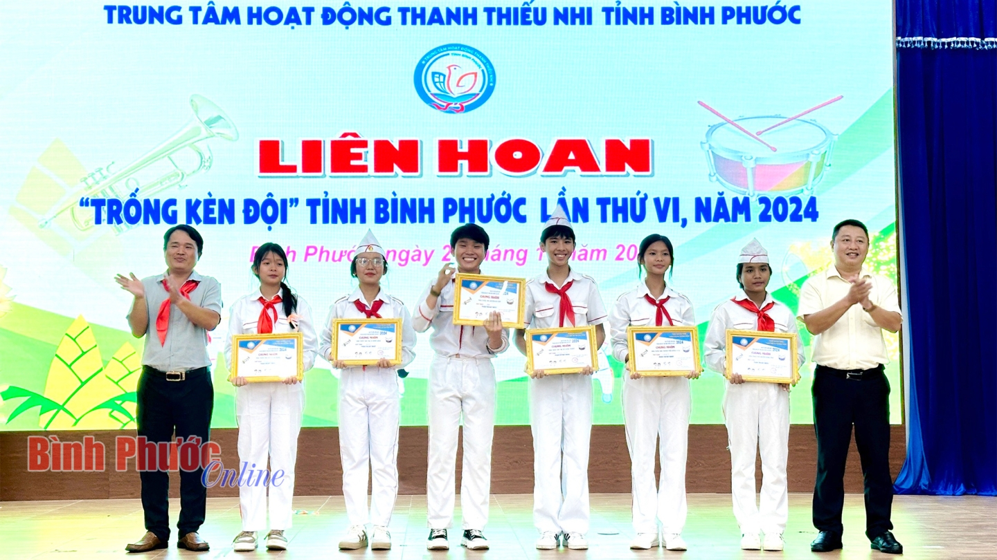 Lãnh đạo Hội đồng Đội tỉnh và Ban tổ chức Liên hoan “Trống kèn Đội” tỉnh Bình Phước lần VI trao giải các nội dung thi tự chọn, bắt buộc và giải toàn đoàn