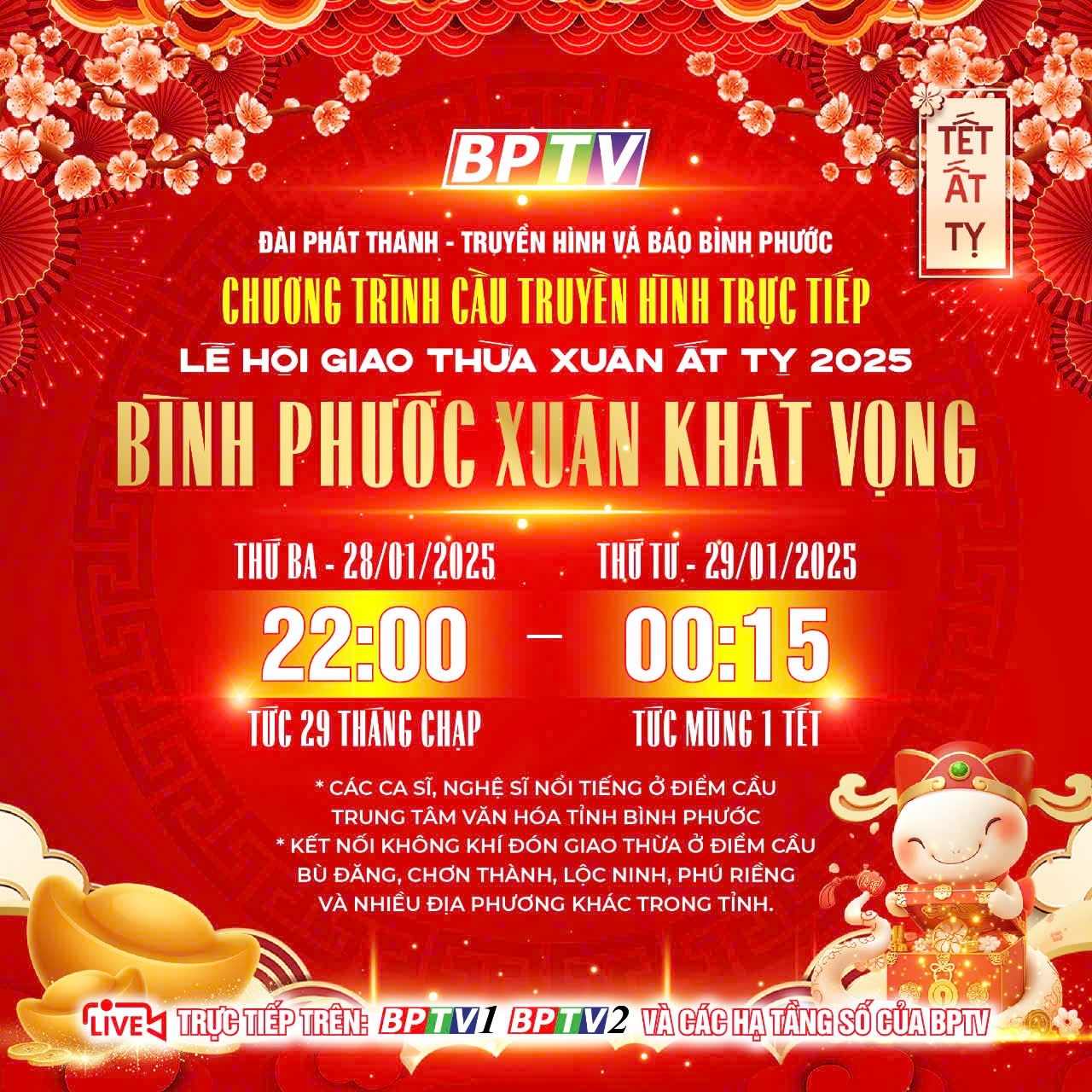 Mời quý khán giả đón xem chương trình cầu truyền hình trực tiếp Lễ hội giao thừa tết Ất Tỵ 2025 từ 22 giờ ngày 28-1 (đêm 29 Tết) đến 00 giờ 15 phút ngày 29-1 (mùng 1 tết) trên kênh BPTV1, BPTV2 và các hạ tầng số của Đài Phát thanh - Truyền hình và Báo Bình Phước.
