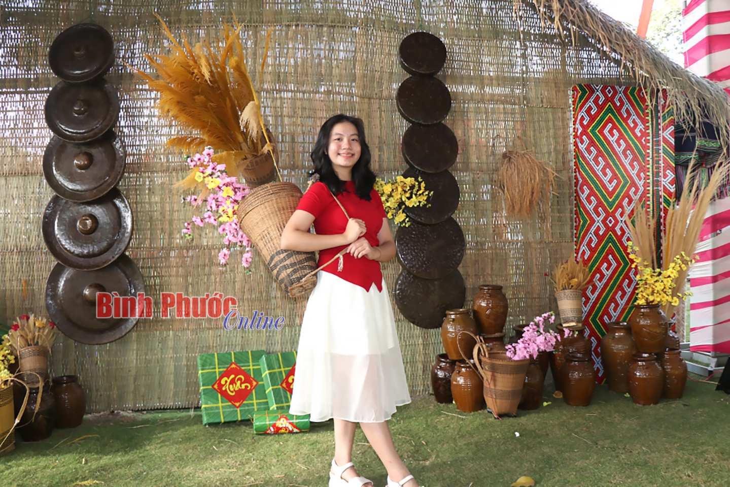 Bé Phạm Ngọc Nhi, lớp 7, trường THCS Tiến Thành, thành phố Đồng Xoài thích thú khi tự trải nghiệm đeo gùi của đồng bào S’tiêng và lưu lại khoảnh khắc ấm áp cùng gia đình. Ngọc Nhi chia sẻ: Những năm trước con thường chụp hình hoa, quả, cây cối mùa xuân với gia đình. Năm nay, con thấy rất thú vị khi được trải nghiệm trong những nét văn hóa của các dân tộc thiểu số trên địa bàn tỉnh. Qua đó, con càng được tìm hiểu thêm về văn hóa đặc sắc của tỉnh mình.