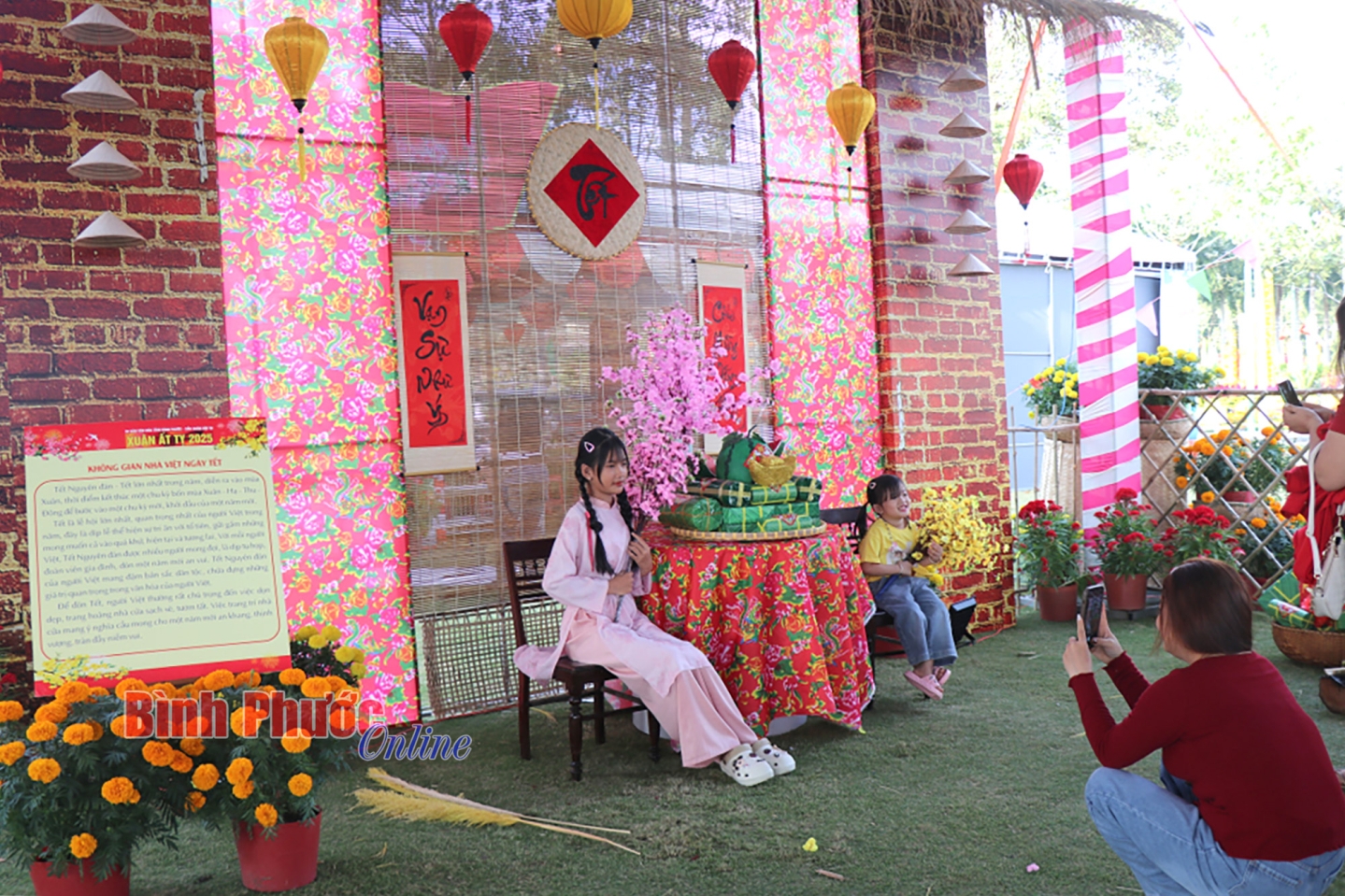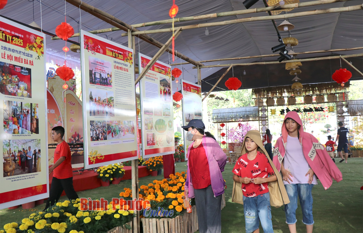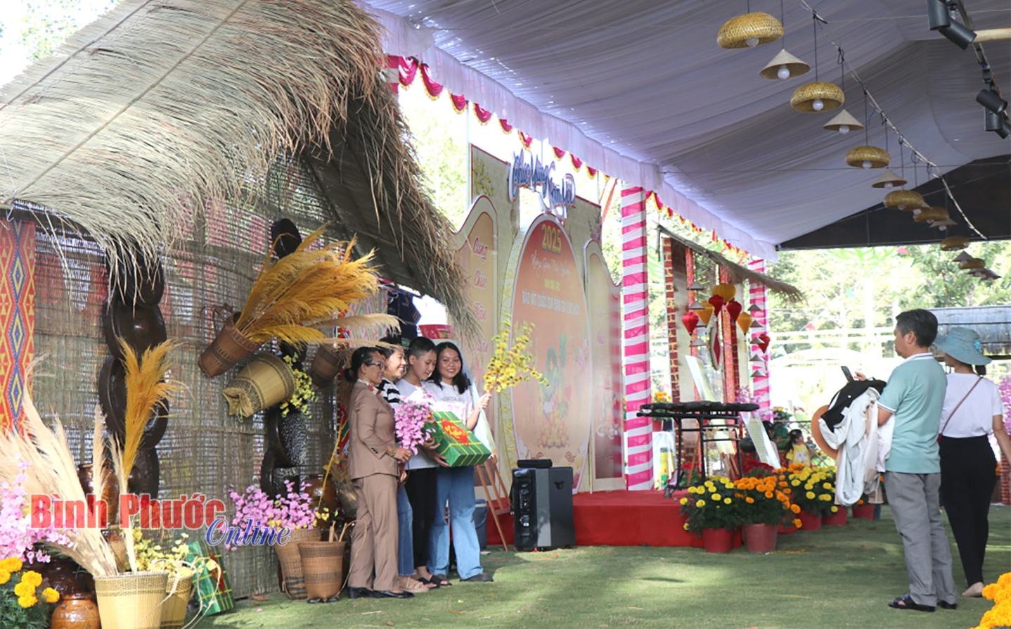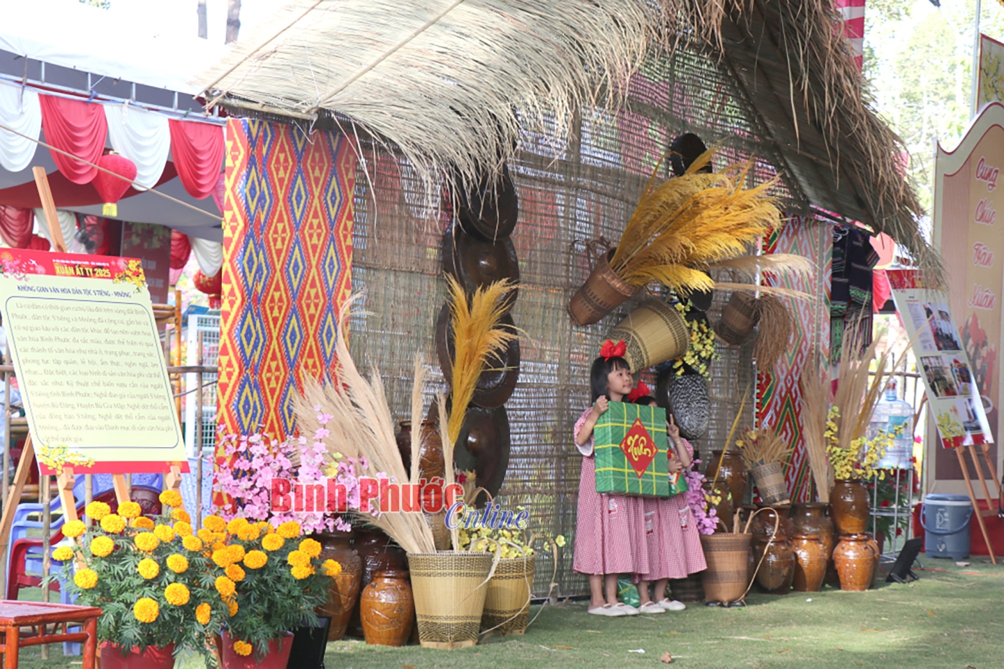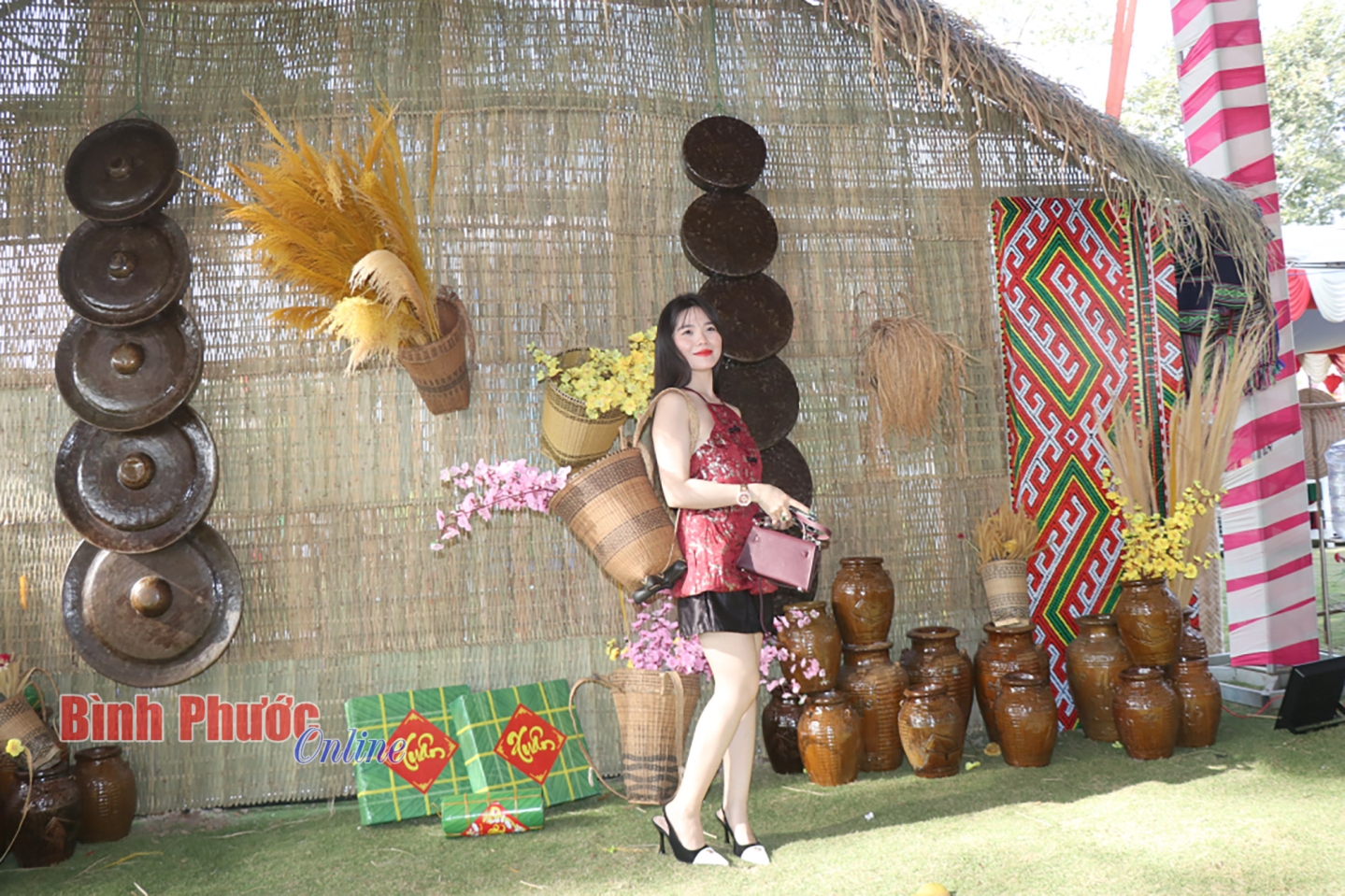 Tiểu cảnh không gian văn hóa người S’tiêng và M’nông với mái nhà truyền thống của người S’tiêng và M’nông Bình Phước, chất liệu tranh tre, bên trên treo cồng chiêng, hình ảnh về lễ hội, trưng bày tố, ché rượu cần, các trang phục thổ cẩm, gùi truyền thống của người S’tiêng và M’nông phục vụ du khách chụp hình kỷ niệm. Tiểu cảnh không gian trưng bày và trải nghiệm bản chế tác Bảo vật quốc gia đàn đá Lộc Hòa. Tiểu cảnh không gian nhà Việt ngày tết với câu đối, bánh chưng, đèn lồng, mái tranh thật. Cùng các tiểu cảnh đặc sắc, “Di sản văn hóa Bình Phước - sắc xuân hội tụ” còn trưng bày 32 pano về hệ thống các di tích, di sản văn hóa phi vật thể trên địa bàn tỉnh Bình Phước.