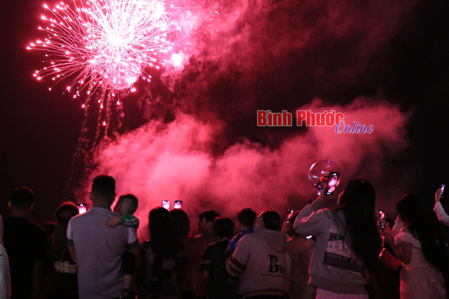 Người dân thị xã Chơn Thành thưởng thức pháo hoa trên bầu trời. Nhiều người dùng điện thoại ghi lại những khoảnh khắc đẹp