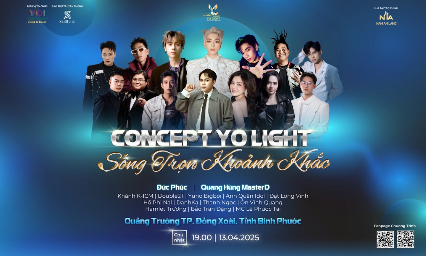 Công ty tổ chức sự kiện Yo Light Garden Events chính thức thông báo sự kiện âm nhạc CONCEPT YO LIGHT 2025 hoành tráng sẽ diễn ra tại Quảng trường TP. Đồng Xoài, Bình Phước vào 13-4-2025. Đây hứa hẹn sẽ là một đêm nhạc đỉnh cao với hệ thống sân khấu, âm thanh, ánh sáng đạt tiêu chuẩn quốc tế, quy mô hơn 10.000 khán giả tham dự.