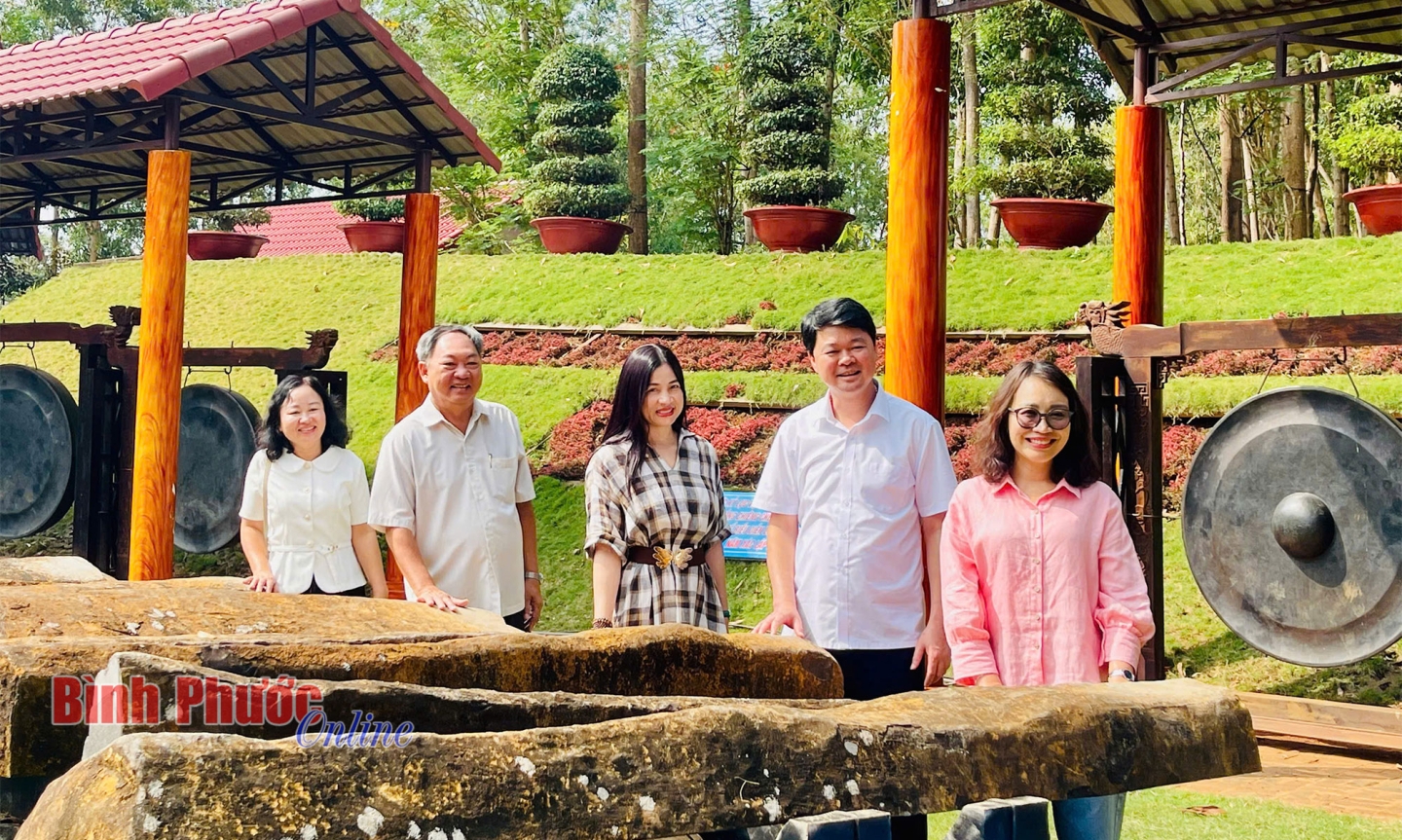 Giám đốc - Tổng Biên tập Đài Phát thanh - Truyền hình và Báo Bình Phước Nguyễn Thị Minh Nhâm cùng đoàn công tác Báo Thái Nguyên bên bộ đàn đá lớn nhất Việt Nam