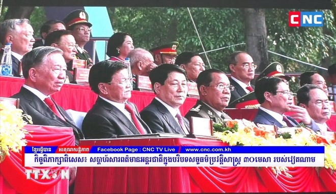 Đài truyền hình CNC TV phát hình ảnh Lãnh đạo Đảng, Nhà nước Việt Nam và lãnh đạo Campuchia, Lào (ảnh chụp màn hình) tham dự lễ kỷ niệm 50 năm Ngày Giải phóng miền Nam, thống nhất đất nước (30-4-1975 - 30-4-2025) tại Thành phố Hồ Chí Minh. (Ảnh: TTXVN phát)