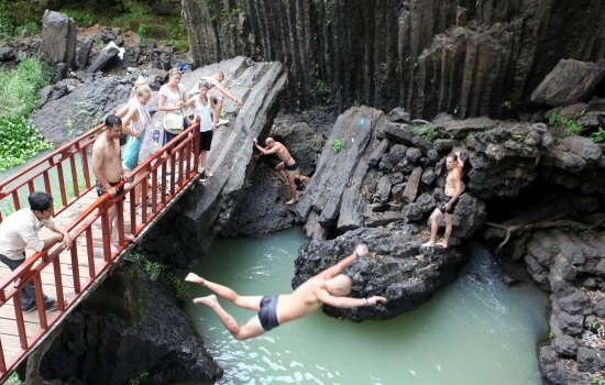 Những du khách thích mạo hiểm thường tìm cách lách người qua vách đá cạnh dòng thác đổ để vào khoảng không gian mờ ảo bên trong rộng hàng ngàn m2, nơi xưa kia hoàng tử Nur hóa thân để cảm nhận làn hơi nước mát lạnh lan tỏa, hay giang tay nhảy từ chiếc cầu nhỏ vào vùng nước trong xanh dưới chân ngọn thác.