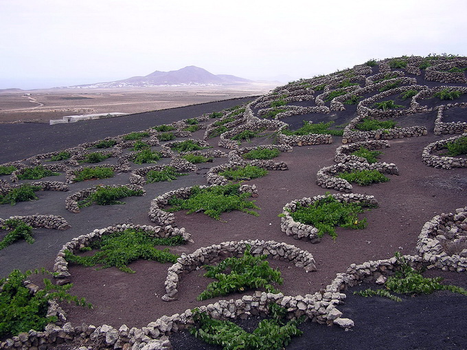 Một cảnh quan không nơi nào có được ở Lanzarote là những nông trại nho có một không hai trên thế giới. Đó là những vườn nho bạt ngàn được trồng trong những hố nhỏ đều tăm tắp theo phương thức canh nông khô.