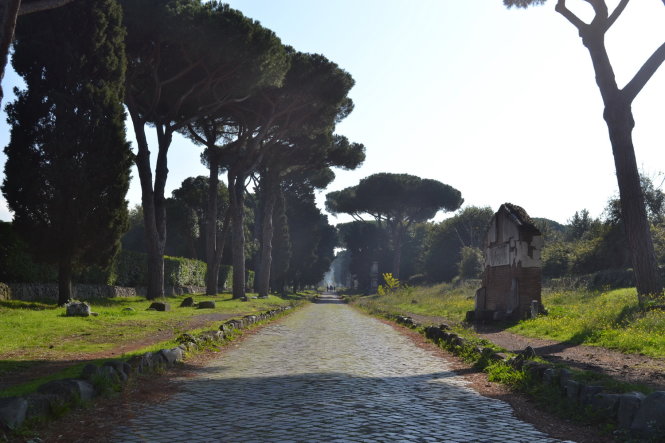 Đó là những cánh đồng xanh mát hai bên đường thỉnh thoảng được điểm xuyết bằng các tàn tích còn sót lại từ lịch sử vĩ đại của Roma cùng những hầm mộ thời La Mã với kiến trúc tinh xảo nằm rải rác trên đường.