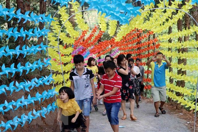Đường lên khu du lịch đồi thông được trang trí bởi hàng nghìn chiếc chong chóng với đủ màu sắc. (Ảnh: Công Tuyên/TTXVN)