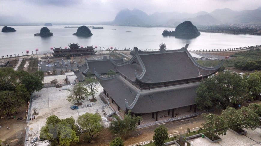 Chùa Tam Chúc được xây dựng đặc biệt với 12.000 bức tranh đá miêu tả các sự tích của Đức Phật được những nghệ nhân tạc bằng đá núi lửa ở Indonesia. (Ảnh: Trọng Đạt/TTXVN)