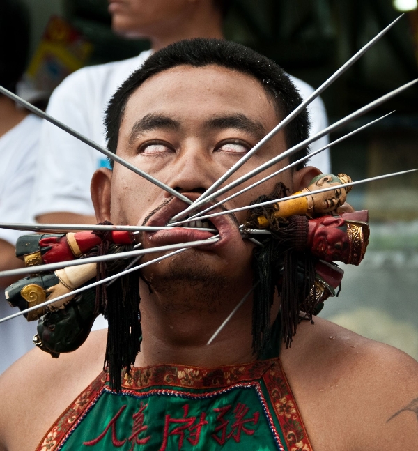 Hành xác hay chịu đựng sự đau đớn theo những tín đồ Phật giáo Thái Lan sẽ mang lại sự may mắn, thành công trong sự nghiệp, sức khỏe và bình an cho gia đình, bản thân. Chính vì vậy, tại lễ hội này, du khách sẽ phải rợn tóc gáy khi chững kiến những trai tráng khỏe mạnh sẽ nhịn ăn và sử dụng mọi vật dụng sắc nhọn từ dao, móc, khuyên đến búa, rìu, kiếm để xuyên qua miệng, mặt và những bộ phận khác trên cơ thể.