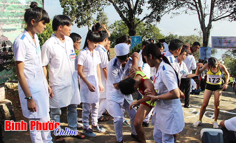 Trên đường chạy, các VĐV hối hả, cố sải bước để về đích. Đó cũng là lúc đội ngũ y tế tất bật với những bước chạy nhằm đảm bảo phục hồi thể lực và sơ cứu kịp thời những tình huống xấu cho VĐV. Bác sĩ Nguyễn Văn Hiền cho biết: “Chúng tôi huy động nguồn nhân lực tốt nhất từ Bệnh viện Đa khoa thị xã Phước Long cho giải này. Mọi thành viên đều được tập huấn kỹ. Nhờ đó, không có trường hợp đáng tiếc nào xảy ra”.