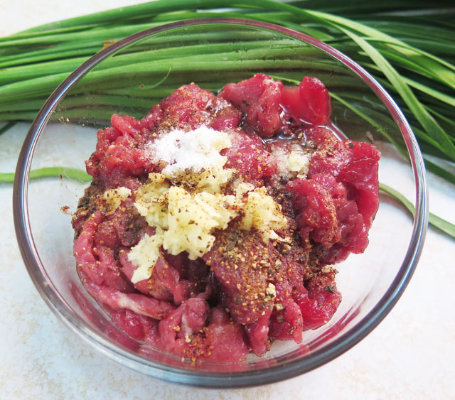 Thịt bò rửa sạch, để ráo, xắt mỏng vừa ăn. Tỏi lột vỏ, băm nhỏ. Ướp thịt với gừng băm, 1/2 tỏi băm, 1/4 muỗng cà phê muối, một muỗng cà phê đường, hai muỗng cà phê hạt nêm, một muỗng cà phê dầu ăn, 1/4 muỗng cà phê tiêu, để ngăn mát tủ lạnh 15 phút.