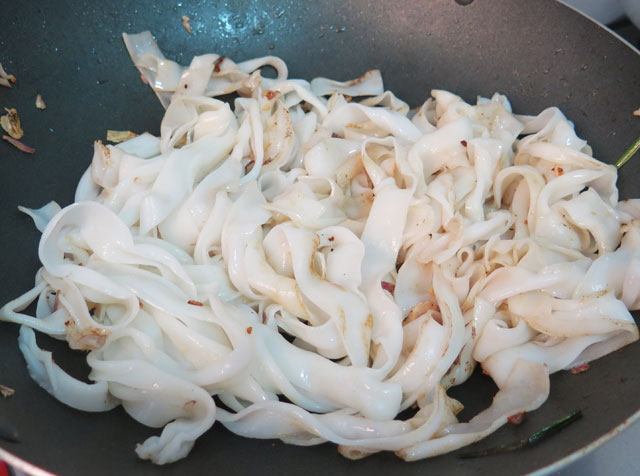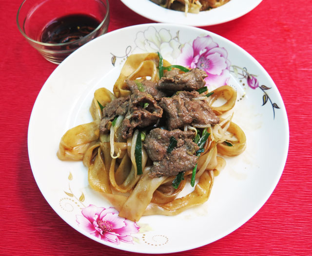Cho hỗn hợp hắc xì dầu vừa khuấy vào phở, trộn đều, để lửa lớn, xào cho phở thấm đều gia vị. Sau cùng cho thịt bò, giá, hẹ, hành vào đảo đều, tắt bếp.