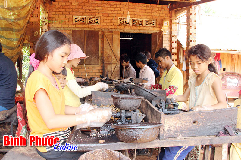 Tranh thủ gần 3 tháng hè, trẻ em thôn 2, xã Long Tân (Bù Gia Mập) đi chẻ hạt điều thuê để kiếm tiền mua quần áo, sách vở chuẩn bị cho năm học mới.