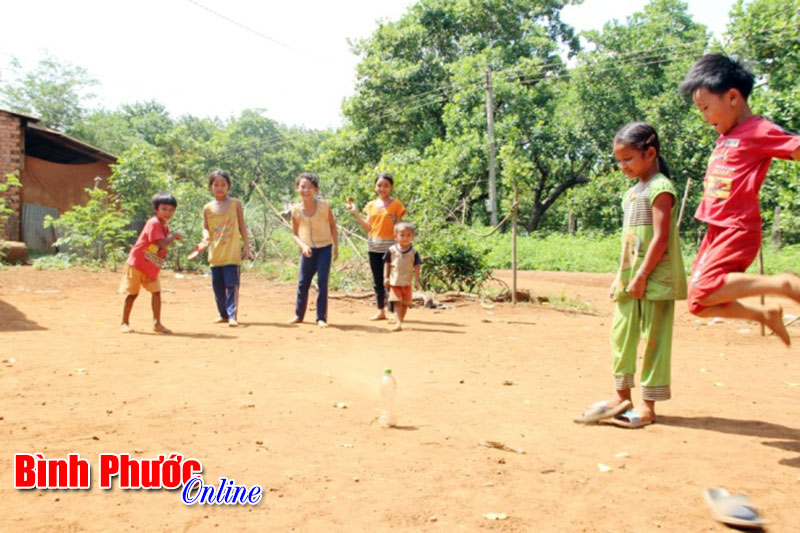 Thiếu sân chơi, trẻ em thôn Bù Ka 1, xã Long Hà (Bù Gia Mập) tìm những mảnh đất trống trong vườn để chơi các trò dân gian.