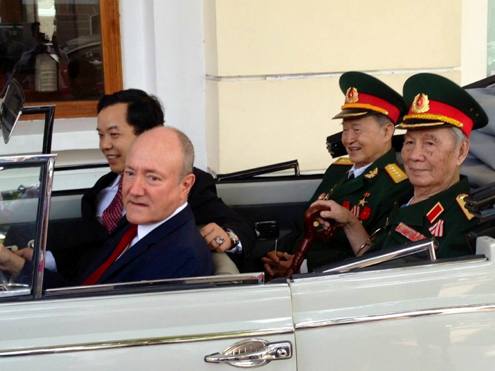 GS Larry Berman cùng các đồng đội cũ của ông Ẩn, Mười Nho và Tư Cang, giám đốc First News Nguyễn Văn Phước trên chiếc xe Renault 4 của ông Ẩn