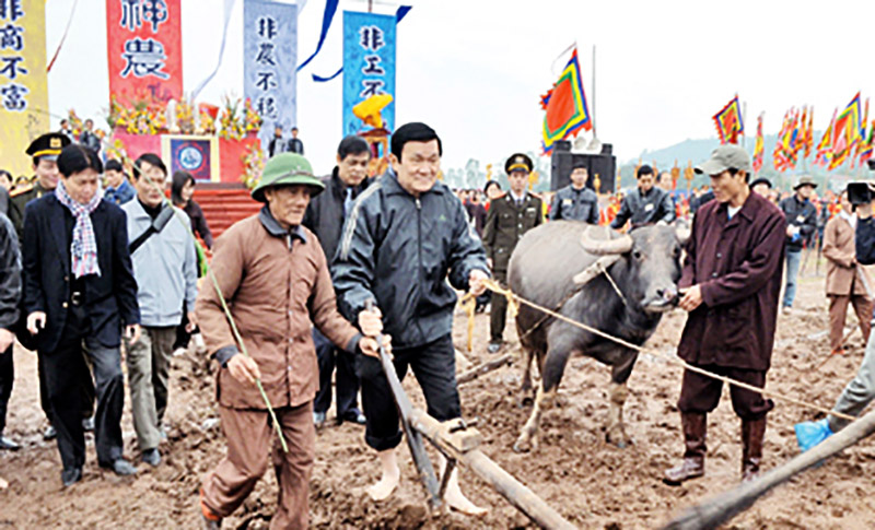 Chủ tịch nước Trương Tấn Sang xuống đồng cày ruộng trong lễ hội Xuống đồng tại xã Đọi Sơn, huyện Duy Tiên (Hà Nam) - Ảnh: Internet