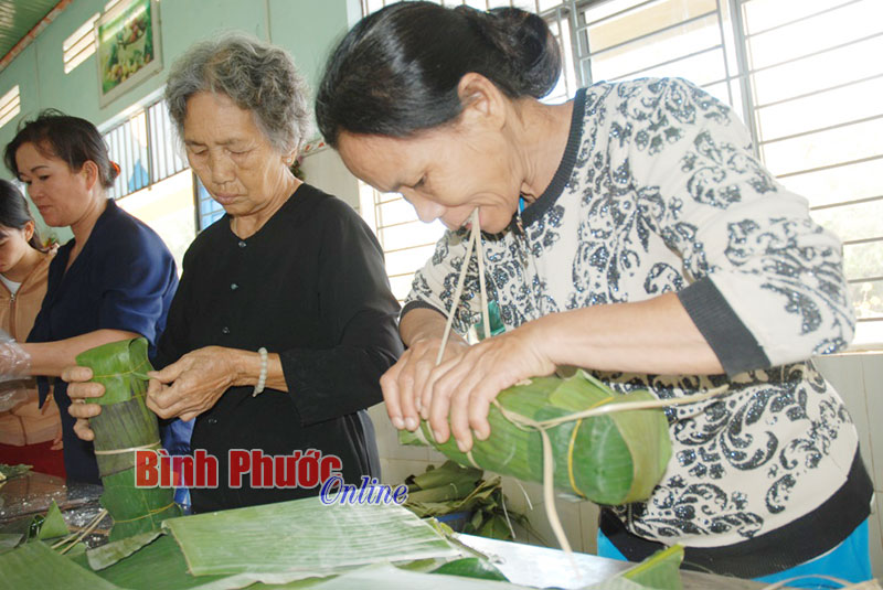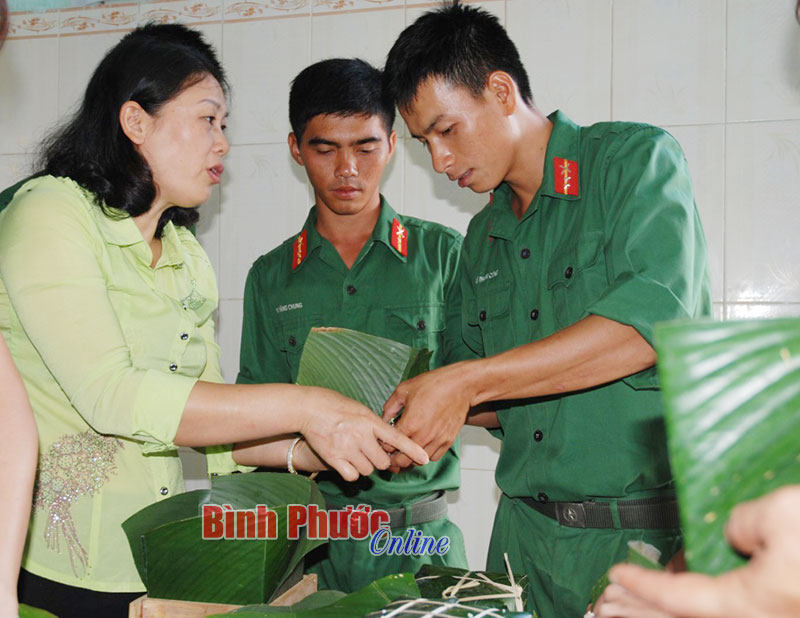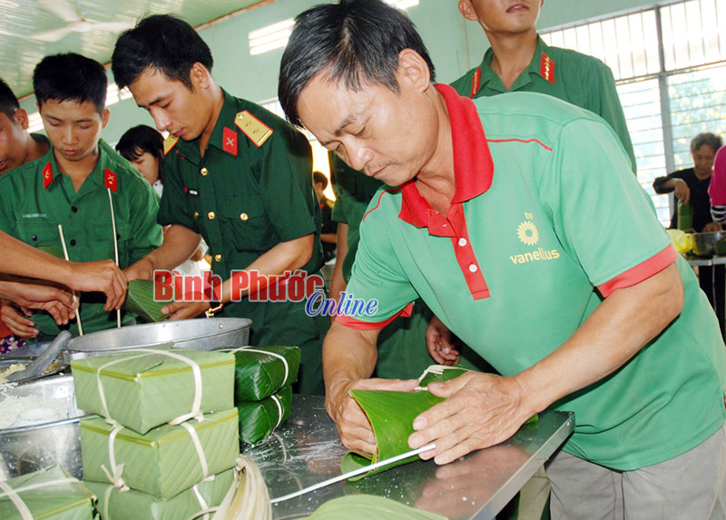 Hơn 9 giờ sáng, các chị, các má và hàng chục chiến sĩ bắt tay vào làm những đòn bánh tét, chiếc bánh chưng vuông vức tạo không khí ấm áp đầy nghĩa tình.