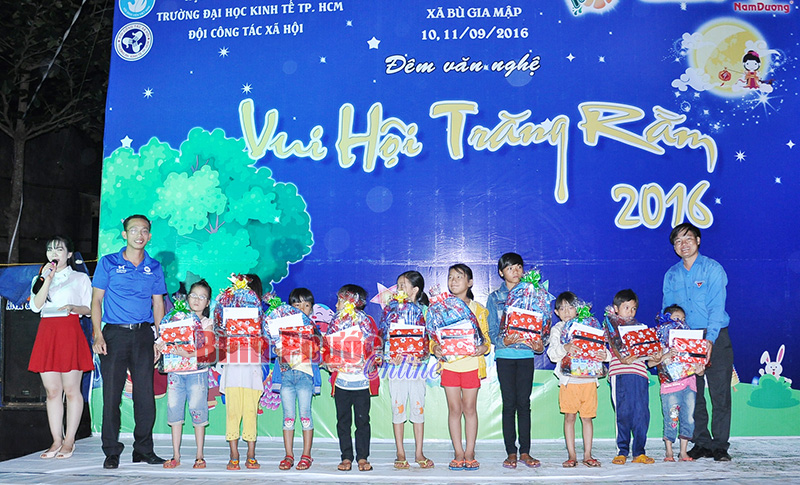 Đêm hội trăng rằm 2016, các em thiếu nhi trong huyện đã đón tết Trung thu sớm với 4.150 chiếc bánh trung thu và đèn lồng. Trường đại học Kinh tế TP. Hồ Chí Minh còn tặng 40 suất học bổng cho học sinh nghèo vượt khó, trị giá mỗi suất từ 300-500 ngàn đồng; 20 phần quà cho gia đình chính sách, trị giá mỗi phần 500 ngàn đồng; 1.000 áo trắng cho học sinh. Tại các điểm vui chơi, hàng trăm em nhỏ háo hức tập trung từ rất sớm và được hòa mình vào nhiều trò chơi vui nhộn, mang lại những tiếng cười rộn rã. Dưới đây là một số hình ảnh vui tết Trung thu của các em được phóng viên ghi lại.