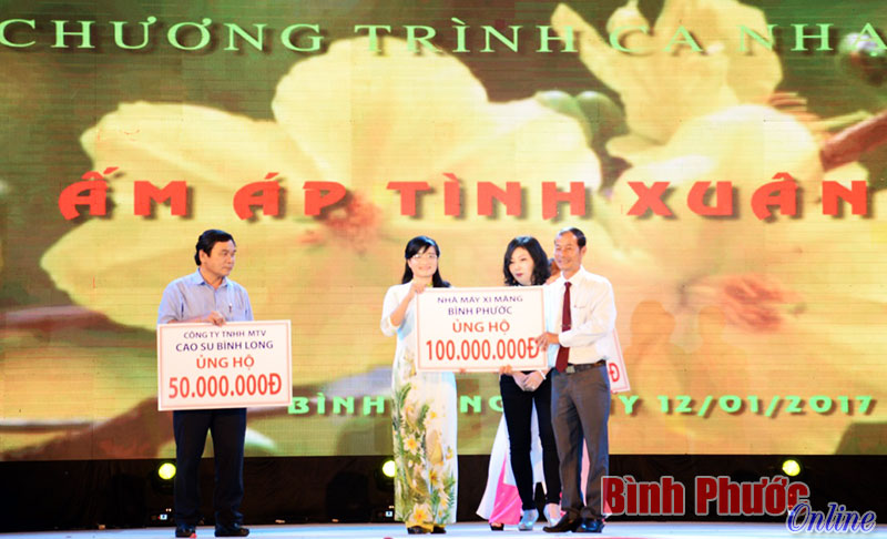 Các doanh nghiệp trao bảng tượng trưng ủng hộ tại đêm nhạcChương trình ca nhạc “Ấm áp tình xuân” được tổ chức thường niên mỗi khi đến tết xuân về, thông qua chương trình nhằm vận động các doanh nghiệp, nhà hảo tâm ủng hộ chăm lo tết cho người nghèo.