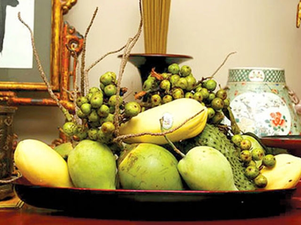 Những quả chín đỏ đặt xung quanh. Những chỗ khuyết đặt xen kẽ quýt vàng, táo màu xanh hoặc những trái ớt đỏ mọng, hoàn thiện những nét trang trí cuối cùng.