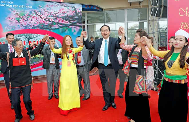 Chủ tịch nước Trần Đại Quang cùng tham gia điệu múa xòe với cộng đồng các dân tộc Việt Nam và bà con kiều bào về dự Ngày hộiThay mặt lãnh đạo Đảng, Nhà nước, Chủ tịch nước Trần Đại Quang tới dự, chúc Tết cộng đồng các dân tộc Việt Nam.