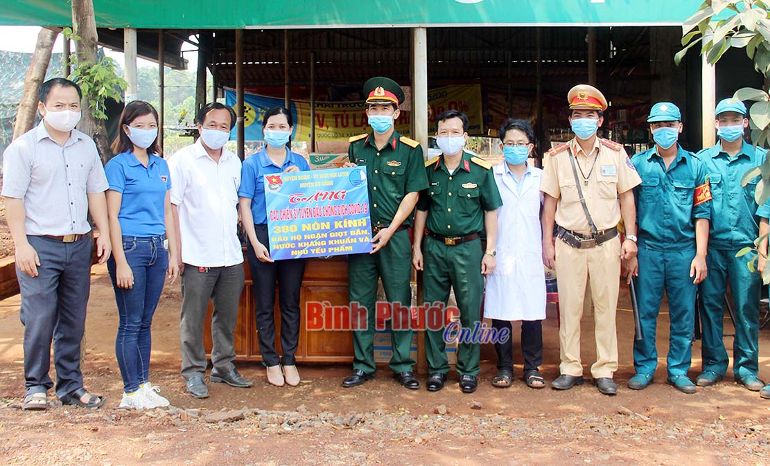 Hội Liên hiệp Thanh niên huyện Bù Đăng trao những phần quà yêu thương cho chốt kiểm dịch ở xã Nghĩa Trung - Ảnh: Cẩm Liên