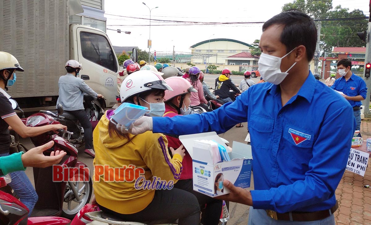 Các đoàn viên đã tặng miễn phí hơn 3.000 khấu trang y tế cho người dân lưu thông trên tuyến quốc lộ 14 và công nhân làm việc tại KCN Đồng Xoài II. Toàn bộ khẩu trang phát miễn phí do anh Nguyễn Duy Phong (SN 1982) công tác tại Công ty TNHH bê tông Hùng Vương (thành phố Đồng Xoài) tài trợ.