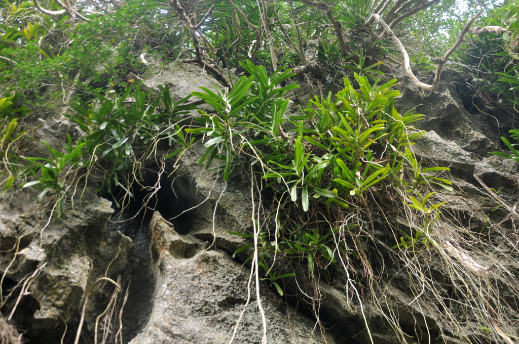 Băng ngang qua khu rừng ngập mặn, chúng tôi tìm đến hang Dơi ở cuối hành trình. Vừa đi, anh Đào vừa chỉ cho chúng tôi thấy vách núi đá với quần thể các loài phong lan tự nhiên sống thành bụi lớn vắt vẻo trên cao, trong đó nhiều nhất là lan đuôi sóc, khi nở thành chùm hoa tím rất đẹp.
