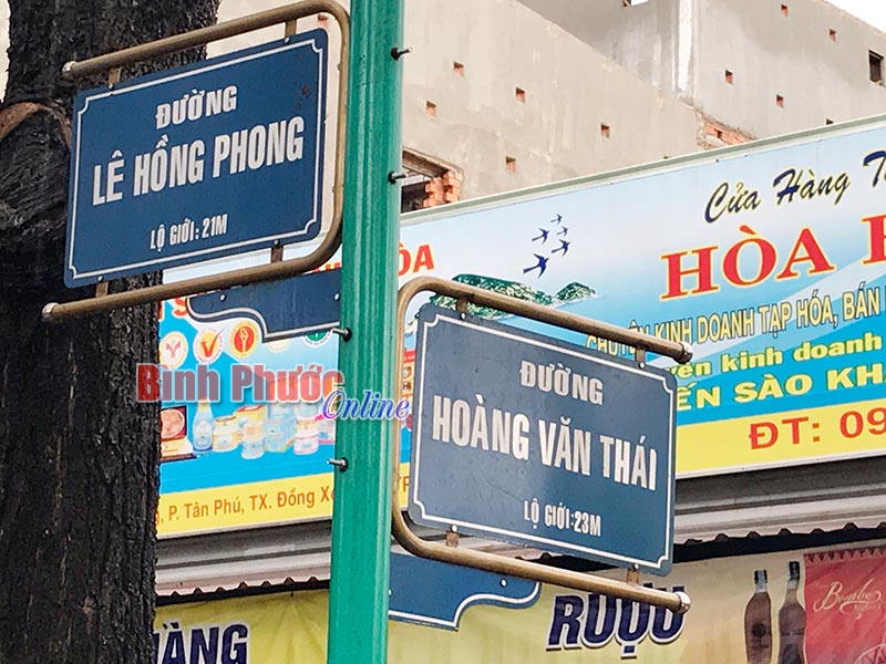 Ngã ba giao nhau giữa đường Hoàng Văn Thái và đường Lê Hồng Phong, thuộc phường Tân Phú, thị xã Đồng Xoài, có 2 biển báo tên đường, dưới tên đường là thông tin về lộ giới (ảnh). Đường Hoàng Văn Thái chạy dài hướng đông - tây, bề mặt rộng khoảng 8-9m, hai bên người dân xây nhà cách mép đường khoảng hơn 2m (chưa có vỉa hè), biển báo lộ giới ghi 23m. Trong khi đó, đường Lê Hồng Phong (hướng nam - bắc, trước cổng Công an tỉnh) nền rộng gấp khoảng 1,5 lần đường Hoàng Văn Thái, có vỉa hè hai bên rộng khoảng 3,5m mỗi bên với cây xanh trồng ở trên, nhưng lộ giới lại chỉ có 21m.