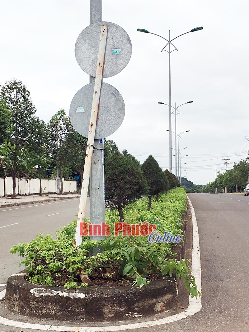 BP - Đường Hồ Xuân Hương (vành đai hồ Suối Cam), thị xã Đồng Xoài là một trong những công trình trọng điểm của tỉnh chào mừng đại lễ 1.000 năm Thăng Long - Hà Nội. Tuy nhiên, trên tuyến đường này, đoạn trước quán cà phê Mây và Nước thuộc khu phố Phú Tân, phường Tân Phú có biển báo giao thông đang “quay lưng” với người và các phương tiện tham gia giao thông. Cột biển báo bị gãy, mặt biển được buộc dựa vào cột điện, vừa mất tác dụng chỉ dẫn, vừa mất mỹ quan đô thị. Biển báo giao thông này hư hỏng đã lâu nhưng đến nay vẫn chưa được các ngành chức năng sửa chữa. Ảnh chụp ngày 28-9-2017.