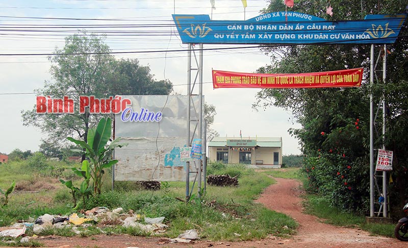 BP - Cổng vào nhà văn hóa cộng đồng ấp Cầu Rạt, xã Tân Phước (Đồng Phú) đang tồn tại một bãi rác, một biển tuyên truyền cũ lem nhem và 2 bên cột cổng chào treo, dán nhiều áp-phích quảng cáo rao vặt. Phía trong cổng chào, 2 đống củi và cỏ cây mọc um tùm trước sân, lối vào, càng làm cho cảnh quan nhà văn hóa ấp nhếch nhác (ảnh).