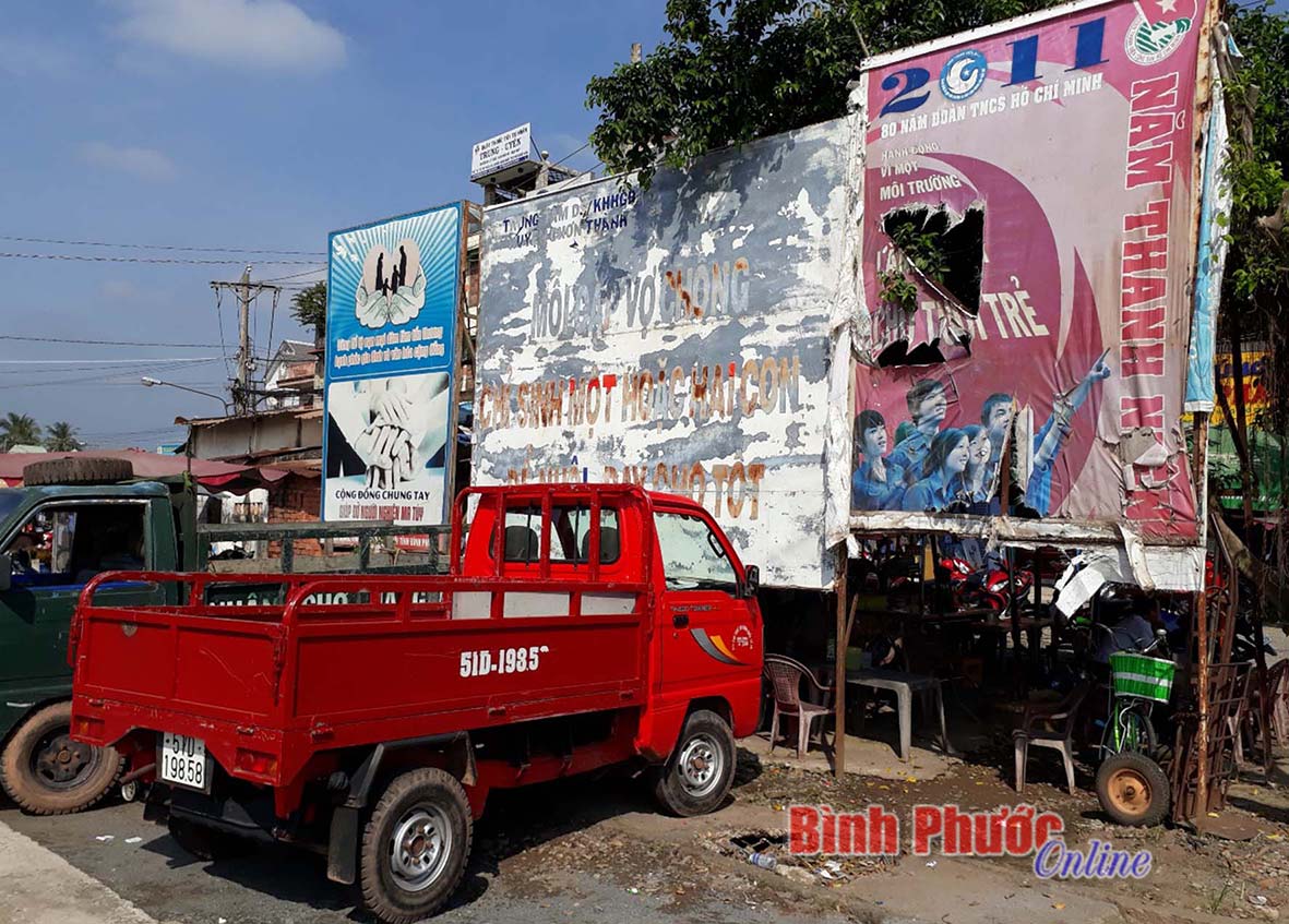 BP - Tại ngã tư Chơn Thành (Chơn Thành) từ lâu tồn tại dãy pa-nô tuyên truyền đã cũ, bạt rách nát, màu sơn mờ nhòe, bong tróc, lem nhem không còn đọc được nội dung và rất phản cảm (ảnh). Đề nghị chính quyền, đoàn thể và ngành chức năng sớm thay mới, đảm bảo cảnh quan sạch đẹp, văn minh.