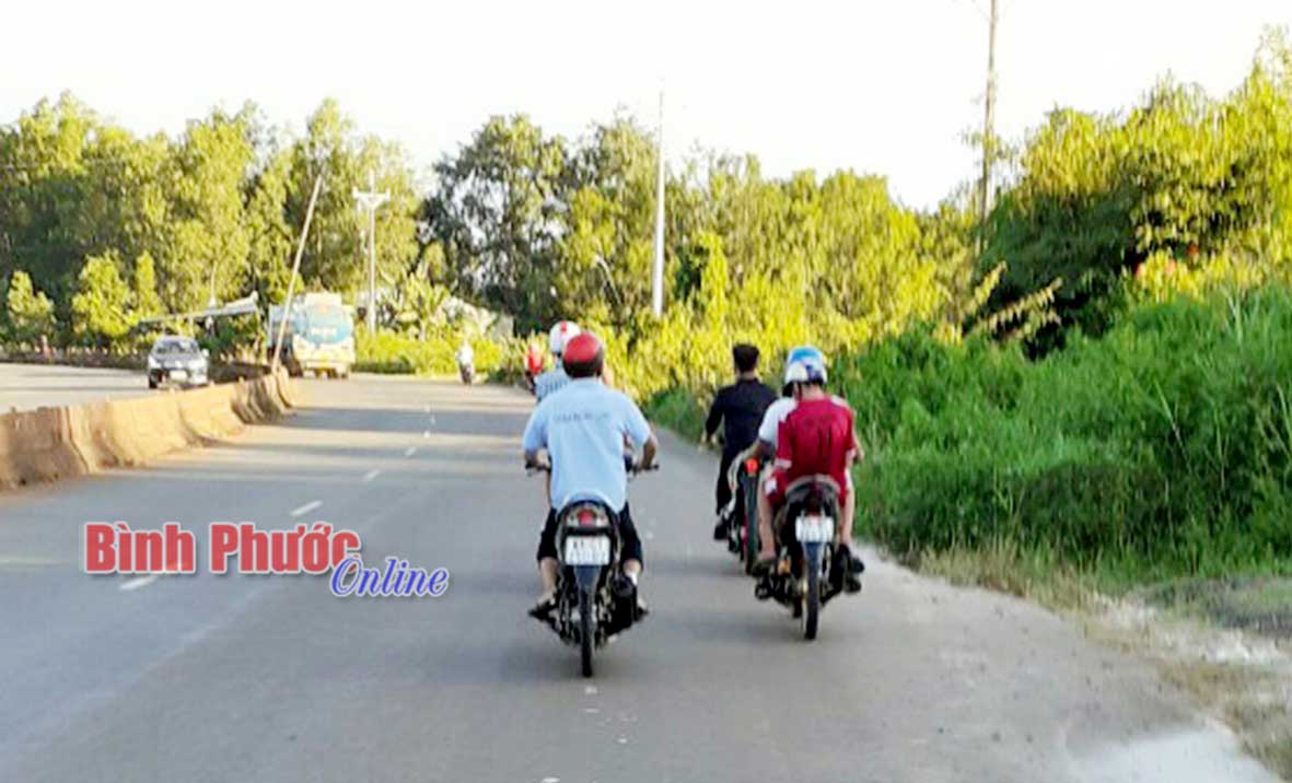 BP - Chiều 26-6, trên đoạn đường ĐT741 đoạn gần cầu Suối Rạt, hướng từ Phước Long đến Phú Riềng, có 1 nhóm thanh niên khoảng 15 người từ 20-23 tuổi, đi xe máy phân khối lớn không đội mũ bảo hiểm, còn quay video cười đùa với nhau.