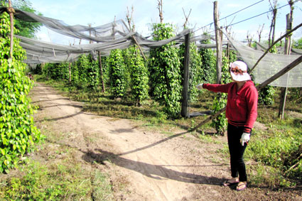 Người dân đã mượn vườn tiêu của gia đình chị Linh làm đường xuống ruộng vì Công ty Lộc Phát 2 đã xóa hơn 100m đường