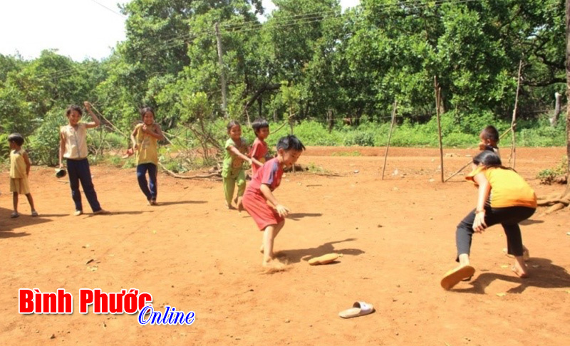 Chúng tôi đến thôn Bù Ka 1, xã Long Hà (Bù Gia Mập) vào buổi trưa nắng gắt, cái nắng làm cho tóc em nào cũng đỏ hoe, vàng cháy. Là thôn có đông đồng bào dân tộc thiểu số sinh sống, lại xa trung tâm xã nên để có sân chơi đúng nghĩa cho các em là rất khó. Vì vậy, xung quanh nơi các em ở, đâu cũng có thể là sân chơi.