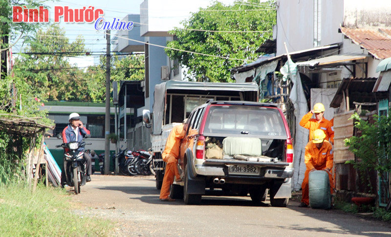 8 giờ sáng ngày 14-8, từ cổng Điện lực Bình Long, hai chiếc xe tải mang biển số 93H-3982 và 93H-1560 di chuyển ra ngoài để đi thi công đường dây điện. Hai xe đều chạy theo hướng đường Nguyễn Huệ đi vào phía sau một căn nhà nhỏ trong hẻm nhà nghỉ Thùy Dương (số 142, đường Nguyễn Huệ, phường Phú Đức). Theo quan sát của chúng tôi, đó là căn phòng nằm ở phía sau một căn nhà cấp 4, chỉ một cửa ra vào, rộng khoảng 4m. Hai nhân viên đứng phía ngoài hút thuốc, còn một nhóm nhân viên khác bước vào trong căn nhà. Gần 20 phút, họ lần lượt khuân ra xe dây điện, điện kế, đồng hồ... Tất cả chia đều lên hai xe và bắt đầu di chuyển. Những nhân viên này làm việc rất tự nhiên và xem như đó là việc làm hết sức bình thường. Một chiếc đi quanh thị xã, chiếc còn lại chạy về hướng xã Thanh Lương (Bình Long).