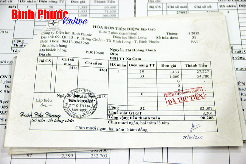 Thay vì hóa đơn chuyên ngành hoặc hóa đơn tự in, Điện lực Bình Long lại “sáng chế” ra loại hóa đơn lập tay để thu tiền điện của khách hàng