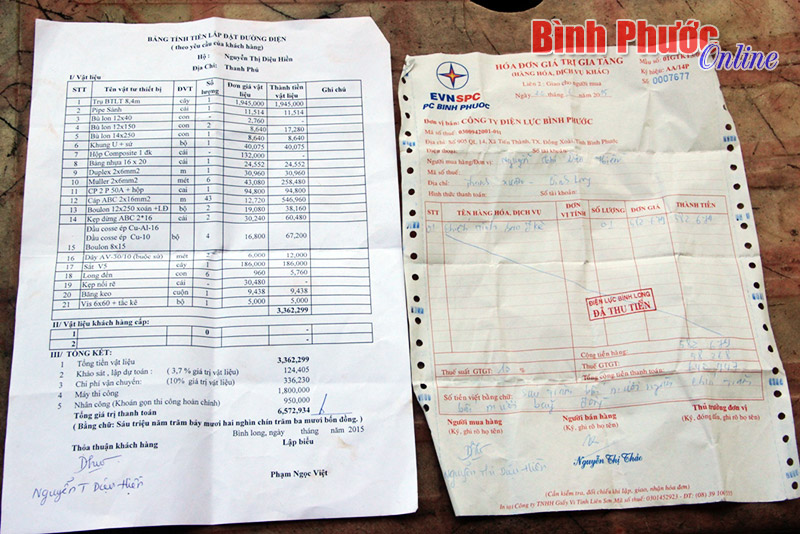 Điều đáng nói là gia đình chị Hiền đóng 7,2 triệu đồng nhưng chỉ nhận được một hóa đơn giá trị gia tăng của ngành điện với số tiền 640.947 đồng. Những gì gia đình chị Hiền nắm giữ chỉ 2 tờ giấy, gồm: Hóa đơn giá trị gia tăng với nội dung chiết tính sao kê điện kế hết 640.947 đồng; Bảng tính tiền đường điện (theo yêu cầu của khách hàng) với 21 nội dung là những thiết bị cần thiết cho đường dây điện tương ứng số tiền 6,572 triệu đồng. Đáng nói là bảng tính này do ông Phạm Ngọc Lai lập và không ghi ngày, tháng, số và ngay cả chữ ký của người có thẩm quyền cũng không. Khi chị Hiền hỏi về các loại hợp đồng, giấy tờ đấu nối điện sinh hoạt thì được nhân viên điện lực trả lời: Người dân chỉ giữ giấy này thôi, còn các loại giấy tờ khác do điện lực giữ.