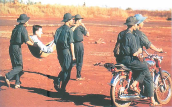 Một tù binh Mỹ (nằm trên võng) được ta trao trả ở Lộc Ninh