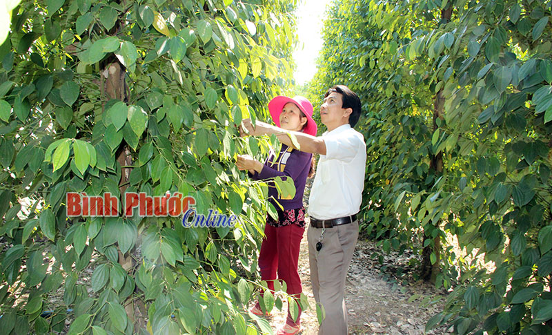 Kinh nghiệm hơn 20 năm của gia đình chị Nguyễn Thị Thơm ở thôn 4, xã Long Bình, huyện Phú Riềng trải qua nhiều giai đoạn trồng tiêu với những phương thức canh tác khác nhau. Năm 1998, gia đình chị trồng thủ công, cây tiêu sống nhờ vào nguồn dinh dưỡng màu mỡ của đất và nước. “Khởi điểm gia đình tôi trồng một vài chục, lên vài trăm, rồi dần lên khoảng 2.000 trụ tiêu. Mỗi sáng sớm và chiều mát, vợ chồng tôi gánh nước bằng đôi vai và chân trần từ suối lên tưới cho vườn tiêu. Mỗi gánh nước tưới được 8 gốc tiêu. Gánh tưới xoay vòng cho cây tiêu nào cũng đủ nước sống. Trải qua nhiều lần mở rộng diện tích, đến nay gia đình tôi có 25 ha tiêu. Hệ thống nước tưới đã được đầu tư tự động và cả máy xịt thuốc, bón phân” - chị Thơm cho biết.