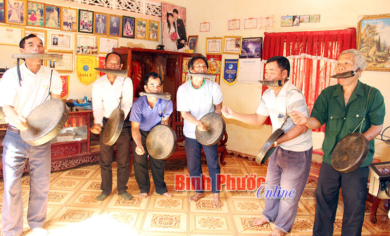 Đội cồng chiêng thôn Phú Nghĩa, xã Phú Nghĩa, huyện Bù Gia Mập tập luyện đánh chiêng kết hợp với kèn sừng trâu.