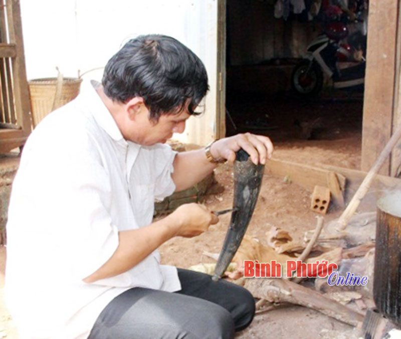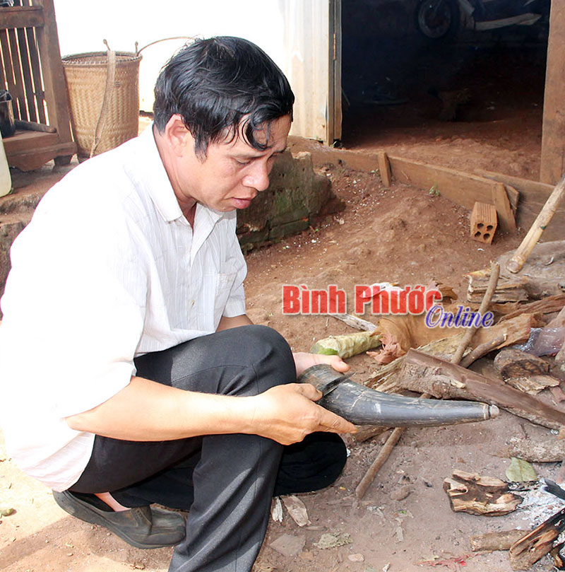 Sừng trâu sau khi hơ lửa được ông Điểu Hoi chuốt gọt mỏng nhằm tạo âm thanh cho kèn.