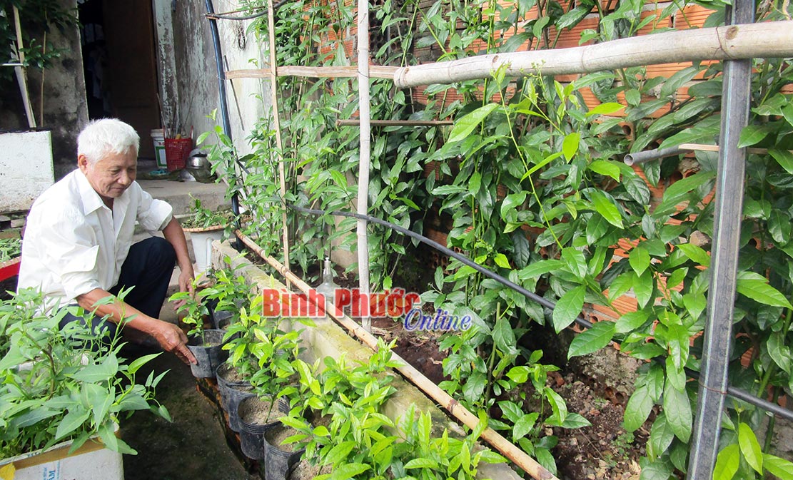 Ông Hoàng Tảo Chính chăm sóc cây xạ đen tại vườn nhà