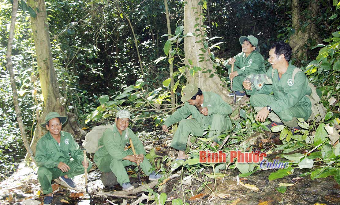 Cộng đồng nhận khoán bảo vệ rừng thôn Bù Dốt, xã Bù Gia Mập, huyện Bù Gia Mập dừng chân nghỉ giữa rừng trong quá trình tuần tra