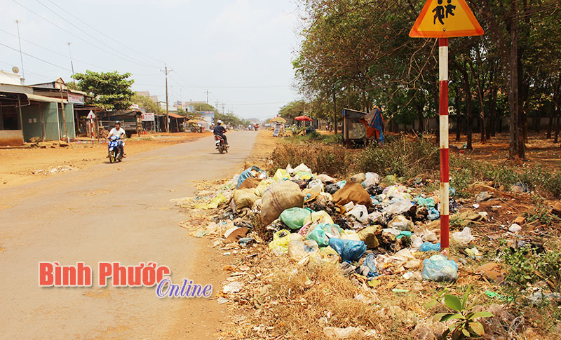 Bên phải đường là nơi tập trung đông dân cư, bên trái là lô cao su. Người dân đã đem rác ra vứt thành đống, gây mất mỹ quan và ô nhiễm môi trường.