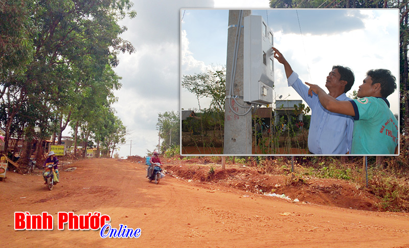 Những đồng hồ điện chỉ dừng lại ở con số 3, 4kW (ảnh nhỏ). Đường vào khu định canh định cư ấp Thạch Màng