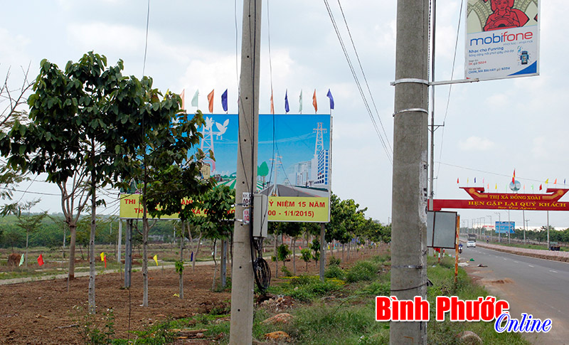Một pa-nô tuyên truyền bị cột điện và hàng cây che chắn nên tác dụng ngược - Ảnh: C.Trung